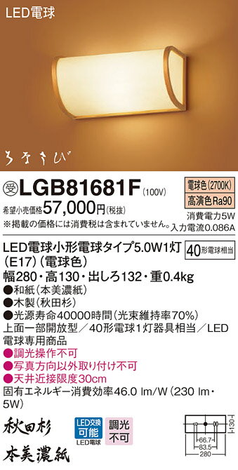 商 品 詳 細商品名インテリア 屋内 照明メーカー名パナソニック Panasonicメーカー器具名称和風照明仕様商品詳細光源◆LED電球小形電球タイプ4.4W1灯(E17)(電球色) ◆色温度:2700 K ◆光源寿命40000時間(光束維持率70%)寸法・質量◆幅:280 mm ◆高:130 mm ◆出しろ:132 mm◆質量:0.4 kg仕様・注意事項LED照明の安心品質◆器具光束:230 lm ◆電圧:100 V ◆消費電力:4.4 W ◆消費効率:52.2 lm/W◆デザイン分類:数寄屋◆【和紙】本美濃紙◆【木製】秋田杉◆Ra84◆上面一部開放型◆40形電球1灯器具相当◆LED電球専用商品◆入力電流(100V時):0.08 A◆調光操作不可◆写真方向以外取り付け不可◆天井近接限度30cm注意事項◆写真方向以外取り付け不可 ※施工・電気工事は専門業者にご依頼ください。